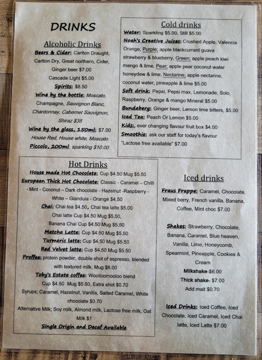 To complement the beverages, Cafe Lava also serves Cascade Light, a selection of Spirits, and refreshing Smoothies. Additionally, the Noah's Juices and Noahs Blended Juice provide fresh, vibrant drinks that pair perfectly with any meal.